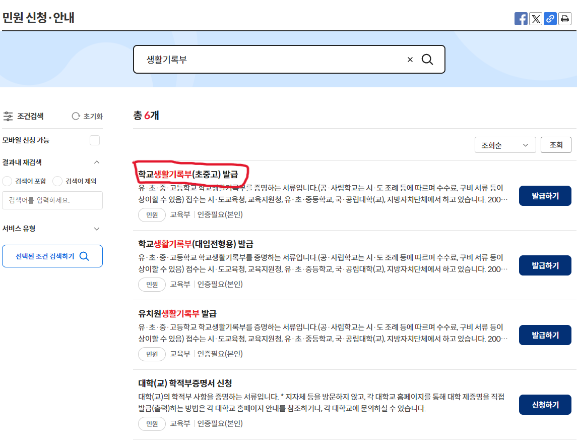 검색창에 ‘생활기록부’를 입력한 후 조회를 진행합니다. 정부24의 검색 기능은 필요한 민원 서류를 빠르게 찾을 수 있는 유용한 도구입니다. 생활기록부뿐만 아니라 다른 교육 관련 서류들을 간편하게 검색할 수 있어, 원하는 서류를 신속하게 발급받을 수 있습니다. 검색어를 정확하게 입력하면 원하는 민원을 빠르게 찾을 수 있으며, 이를 통해 불필요한 시간 낭비 없이 필요한 서류를 빠르게 조회할 수 있습니다. 또한, 검색 결과는 매우 상세하여 여러 선택지 중 필요한 서류를 고를 수 있습니다.