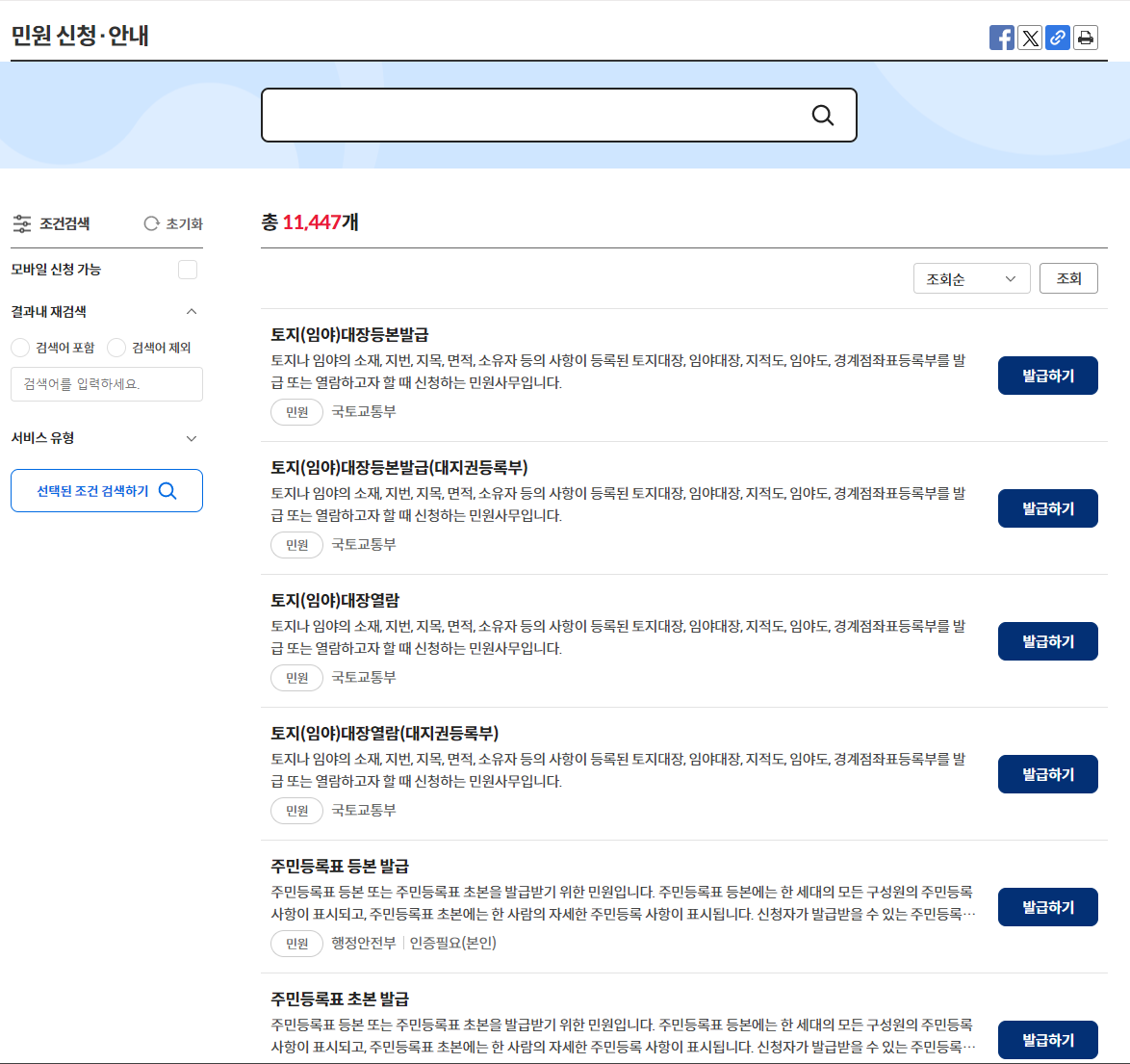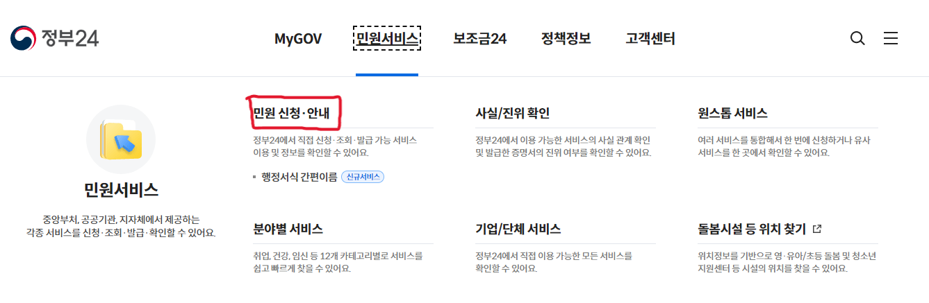 홈페이지 상단 메뉴에서 ‘민원서비스’를 클릭하여 민원 신청을 진행할 수 있는 페이지로 이동합니다. 이 메뉴는 정부24의 핵심 서비스 중 하나로, 국민이 각종 민원 업무를 집에서 처리할 수 있도록 돕습니다. ‘민원서비스’는 시간과 장소에 구애받지 않고 각종 공공 서류를 발급받을 수 있는 기능을 제공합니다. 이러한 서비스는 특히 공공기관을 직접 방문하지 않고도 필요한 서류를 발급받을 수 있어 매우 편리합니다. 온라인 상에서 손쉽게 민원 신청이 가능하기 때문에, 불필요한 이동 시간을 줄일 수 있으며, 서류 처리 과정도 투명하게 확인할 수 있습니다.